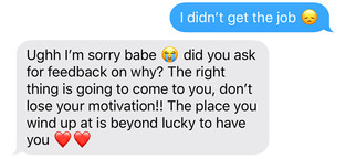 One thing I really had to overcome throughout the process was not letting myself get consumed with disappointment every time a job didn't work out. This is way easier said than done, but one thing that really helped get out of my own way was relying on the people I knew would keep me in a positive and optimistic headspace. I was lucky enough to have my family, friends, and Anthony to talk me off of a ledge whenever I needed it. I leaned on the people that I knew only had my best interest at heart, and would support me through the times where I started to take not getting a job personally. I highly urge anyone in this position to do the same. For me, having a good support system during this time made all the difference. I wanted to include a couple pictures to prove my point with this one. Words of encouragement along the way kept me motivated. Plus, sometimes I really just needed someone to tell me to pick myself up and get over it.